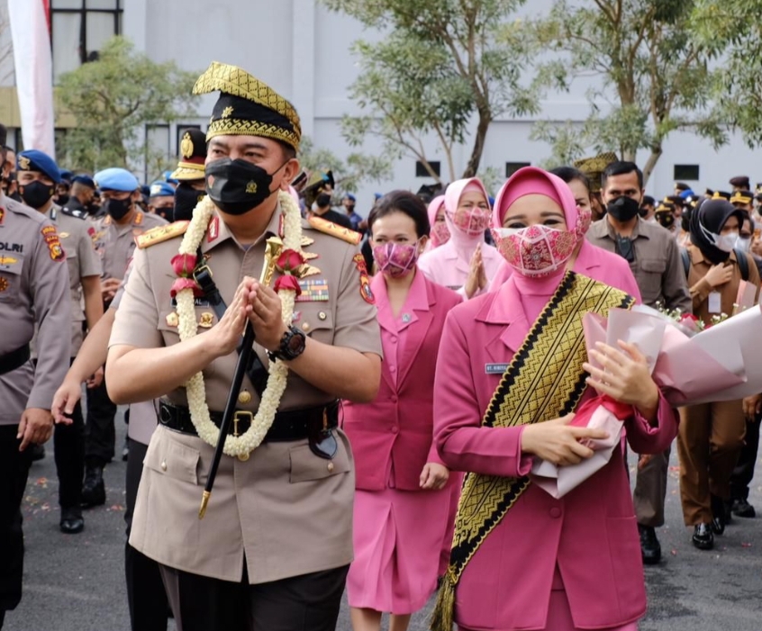 Kedatangan Kapolda Riau Irjen Pol Muhammad Iqbal beserta istri ke Mapolda disambut dengan Jajar Kehormatan oleh personel Polda Riau yang dilanjutkan dengan pengalungan bunga oleh Kapolda yang lama Irjen Pol Agung Setya Imam Effendi di pintu gerbang dan dilanjutkan dengan silat yang diiringi kompang melayu, Senin pagi (3/1/2022) pagi.